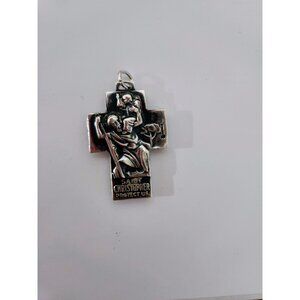 Cross pendant. Reversible, religious symbol. Jesus, Mary and Joseph Pray for Us on one side and on the other side, St. Christopher protect us! Vintage authentic silver. Perfect for anyone who is Christian and loves to wear religious jewelry or use as a keepsake for love and protection. A great gift. Height is just over 1.24 inch x just over .75 inch.