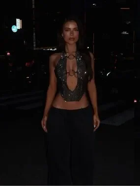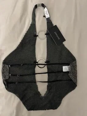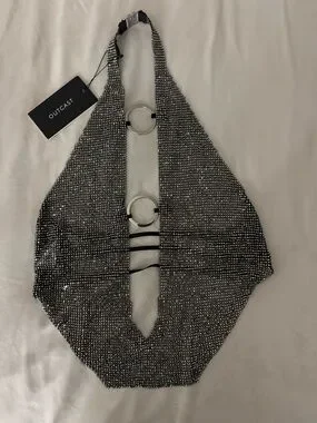 A Silver Rhinestone Backless Top💎 from Outcast Clothing. This top is absolutely stunning and is a free flowing crop top, that has cut outs in the front🤩 It isn’t quite see-thru but boob-covers is recommend ✅ Its giving Britney b*** 🪩 NEVER worn with tags still attached 💅🏾