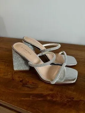 women's silver sandals with sparkling rhinestone straps and a glittering 4” block triangle heel. Sleek open-toe design for evening wear. Cushioned insole for all-night comfort. Elegant silver finish adds instant glamour to any outfit.