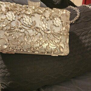 I can't remember where I got this silver clutch, but I know I bought it to go with the red evening gown also for sale on my page. Used once as an accessory/phone holder and never again. Ideal for weddings, prom, or for those who like something sparkly! Closes and opens just fine, and the long chain is removable.