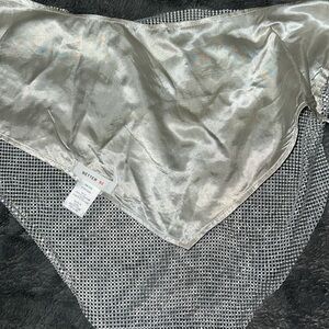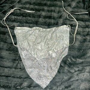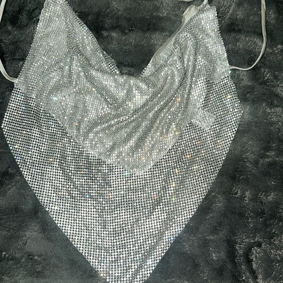 This eye-catching silver rhinestone halter top is a must-have for a night out or special event! The draped design creates a flattering fit, and the sparkling fabric catches the light beautifully.