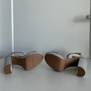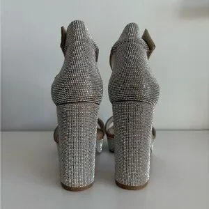 Rhinestone block heels from The Wishbone Collection. Ankle strap secured by Velcro.