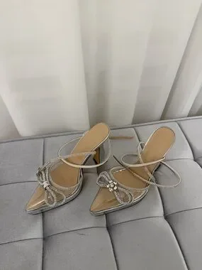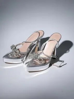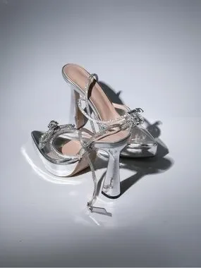 Elegant silver platform mule heels with sparkling rhinestone straps. Sleek metallic finish adds modern glamour. Cushioned insole ensures comfortable wear. Versatile design for evening and special occasions.
