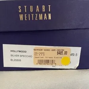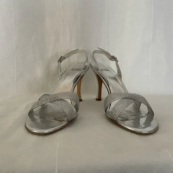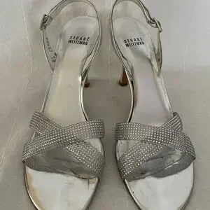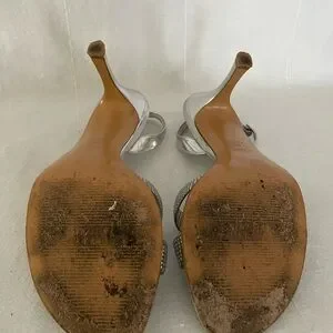 Step out in style with these elegant silver rhinestone strappy heels. Perfect for any occasion, these shoes offer both comfort and sophistication. Worn once. Small discolouration on the left shoe strap. Great condition . Original box.