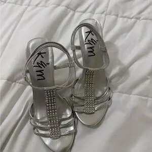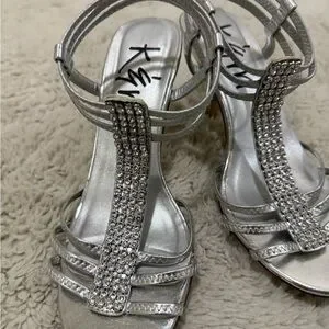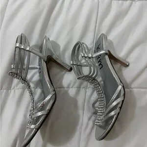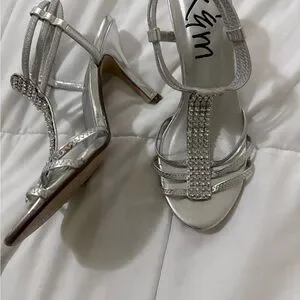 Gorgeous silver strappy heels with sparkling rhinestone detailing down the front. Perfect for grads, weddings, parties, or any formal event.
