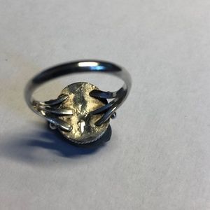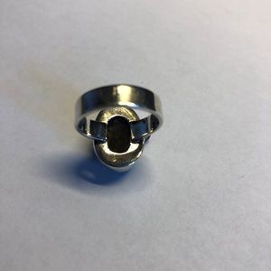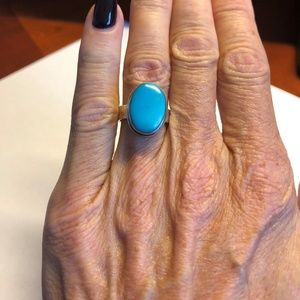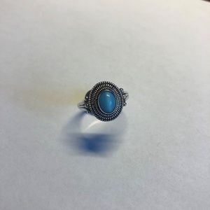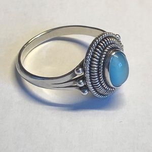 Turquoise and silver ring. Size 5.5 and Cat's eye aquamarine and silver ring. Size 6. No markings but tarnishes like silver jewellery.