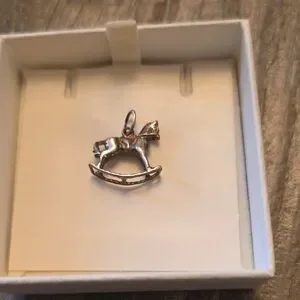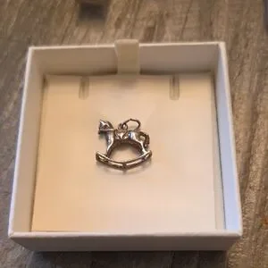 Delicate silver-tone rocking horse charm. Polished finish. Small loop for attaching to a bracelet or necklace. Classic, whimsical design.could not locate stamp but behaves like sterling silver