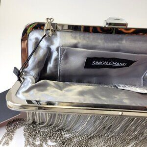 Characterised by its silvery pleated or ruched body, this purse has long tassles of chain link fringe on one side and a plain satiny silver tone back