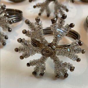 Set of six silver snowflake napkin rings. Elegant and festive design.