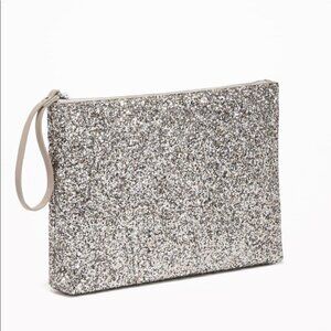 Old Navy Silver and Gray Glitter wristlet. Has a beautiful silver glittery exterior with Zip-top closure. Was bought new, and not used. Has an inside beige fabric lining with a pouch to hold phone. As well, enough room to hold wallet, makeup, keys.