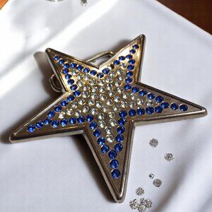 Add some bling to your western look with this stunning silver star belt buckle! Featuring a dazzling center of clear crystals surrounded by cobalt blue stones on the star's outer edge. This new, never-worn deadstock item measures approximately 4.5" x 4.25" and fits a 1.5" belt. Please note: one blue crystal is missing, not noticeable when being worn. A bold statement piece perfect for rodeos, concerts, or adding sparkle to your everyday western wear.