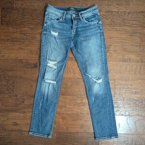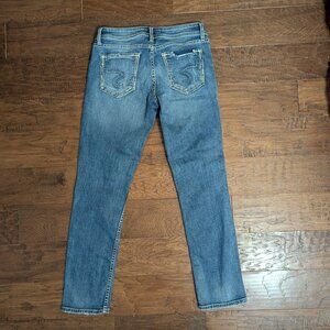 Classic Silver Suki Ankle Slim Distressed Jeans in a versatile medium wash. Designed with a flattering slim fit through the hips and thighs, ankle length cut, and stylish distressed details for that perfect lived-in look.