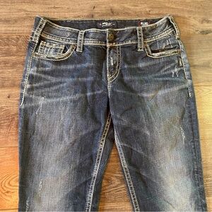 The ultimate curve-flattering jean, suki features a comfortable mid rise and relaxed fit through the hip and thigh. It's crafted with super-stretch denim that's lightweight and incredibly comfortable. This pair is washed to a medium indigo shade with natural hand sanding and whisker patterns. Finished with a classic straight leg and our signature s-scrolls on the back pockets.