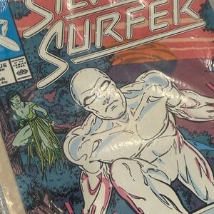 Vibrant Silver Surfer comic cover featuring dynamic artwork. Includes bold colors and striking design. Wrapped in sleeve.