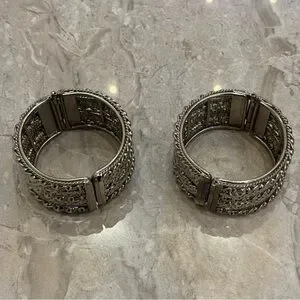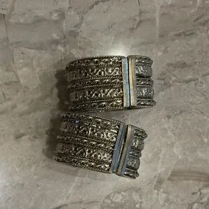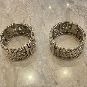 Pair of silver textured cuff bracelets with intricate detailing. Perfect for adding elegance to any outfit.
