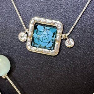 Silver Tone 3 Strands Necklace Blue Square and Round Beads clear Rhinestones