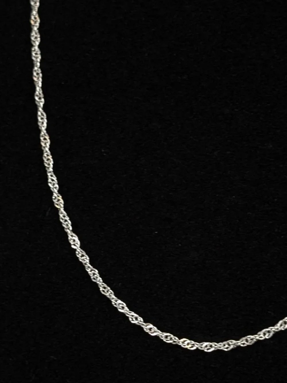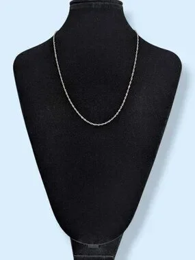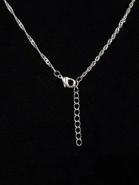 This necklace is made of a silver tone metal and has an adjustable lobster clasp closure. The chain is a rope chain with angular links and it picks up the light nicely. There is normal wear, and no issues affecting wearability.