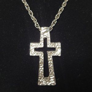 Silver tone multi linked chain featuring a 2" long hammered metal cross. The cross and chain are quite heavy and well made. Very nice unisex look.