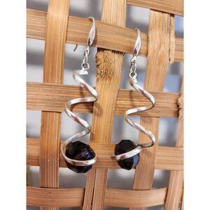 Hand Made dangle vintage earrings. Spiral costume silver tone with a round bottom stone that has a smoky grey colour. Appears darker and less translucent depending on the accompanying light. Spiral area alone with stone 1.5 inches. Entire length 2.5 inches. Excellent against black!