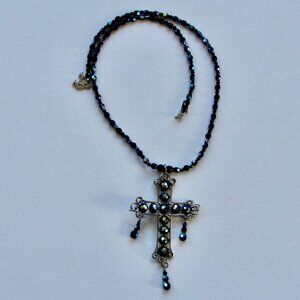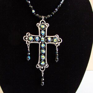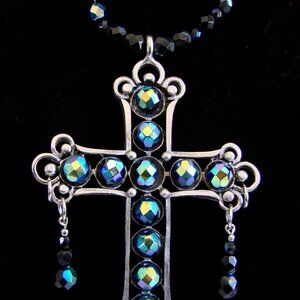 - gorgeous beaded cross necklace features iridescent purple, blue and black beads or crystals or rhinestones showing luminous colours that change when seen from