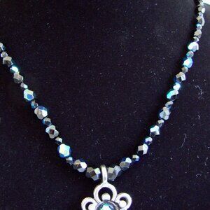 Silver Tone Crystal Cross Necklace Iridescent Purple Blue Beads Scroll Victorian