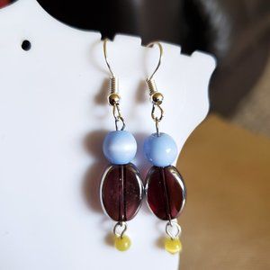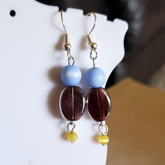 Silver Tone Hook Purple Glass Oval and Blue/Yellow Cat's Eye Bead Dangle Earrings