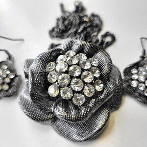 Silver Tone Rhinestone Flower Choker Necklace And Flower Hook Earrings