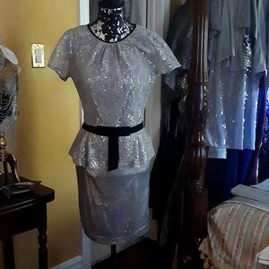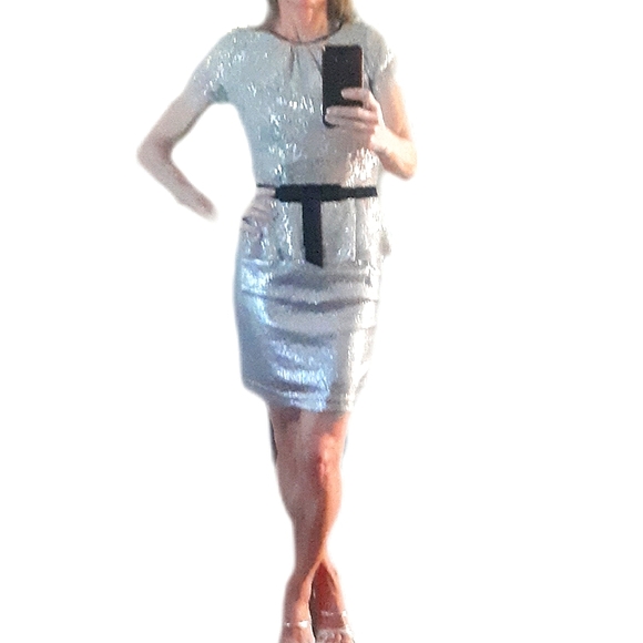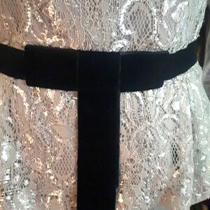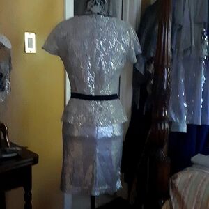 Vintage silver metallic lace top by InWear by Helena with velevet detail at the neckline and a velvet sashed waist with bow which accentuates your waist. Gathers at neck give the top a very feminine look. The top is an 8 but because it is vintage it fits like a S, so I will list it as such. The sequin skirt is a perfect color match. No size but fits like a S but has some stretch to accomodate a larger size. Pristine. Never worn. Also shown is a silver sequin skirt which is a perfect match and is also for sale.