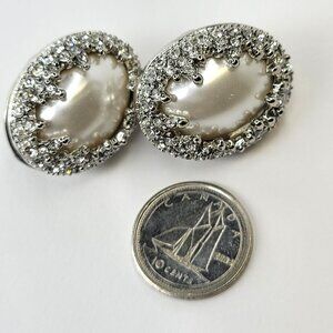 Oval white pearl like cabochon with Silver frame encrusted with crystal rhinestones