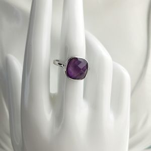 Amethyst is a hard stone known for its powerful vibes of peace and serenity. Ward off negativity in your life with this elegant faceted gemstone ring featuring a stunning deep purple amethyst nestled snugly into in a sleek silver band. Perfect for adding a touch of understated sophistication to your day.