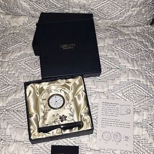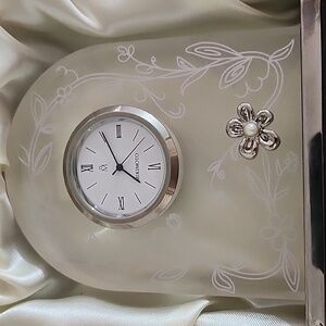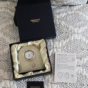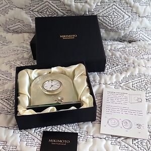 Elegant Mikimoto desk clock. Features a silver frame and white face. Comes in a stylish box.