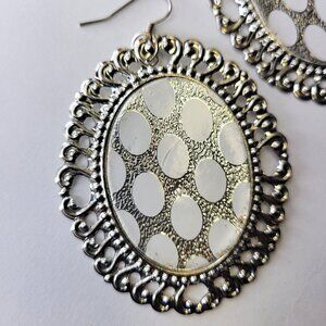 Silver Earrings with white oval pattern on it with a filigree styled framework