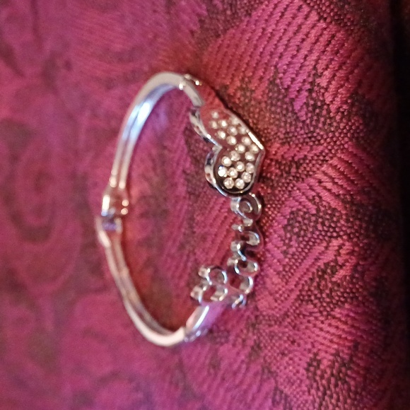 Cute little silver bracelet that says love with a heart that has rhinestones in it. Clasp at back. Not sure how to measure this but my wrist is 7" around and fits me perfectly.