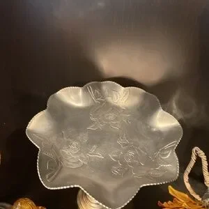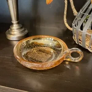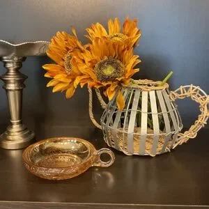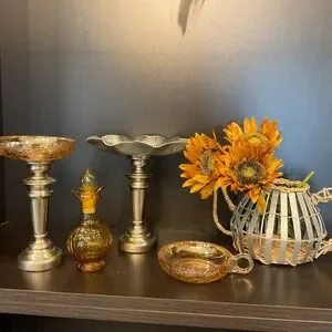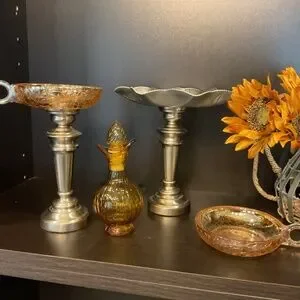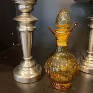 Candle sticks, amber bottle, pickle dishes, tea pot decor
