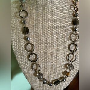 Silver hoop necklace with smoky gray and topaz coloured beads