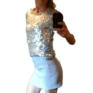 The silver camisole and the 2 sequin silver tops shown also for sale.