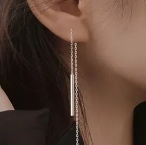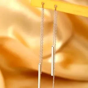 Silver rectangular bar shaped threader dangle earrings