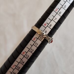 Tiny silver toe or pinky ring with shiny coral red center stone and scroll detailing.