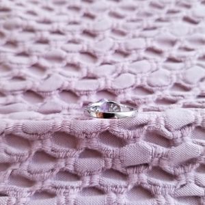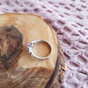 Silver ring with purple and clear cubic zirconia. There is no 925 stamp on the inside so I don't know if this is truly sterling silver. However, this has not tarnished. Good condition. Slight sign of wear. Slightly bigger than size 6.