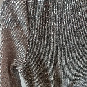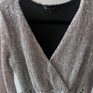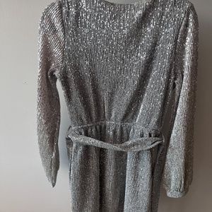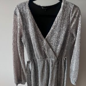 Silver sequinned mini dress, wrap style, long sleeved, size small