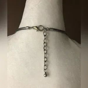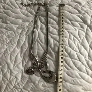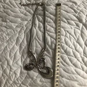 Make a grand entrance with this stunning, oversized stylized butterfly adorned with 3 rhinestones. Silver tone metal throughout, including the 4mm snake chain, lobster claw closure and extension chain. The “wings”, which have an antique finish, are connected with a large jump ring giving the piece enough movement to lay comfortably (and fluidly) on the chest. EU condition.