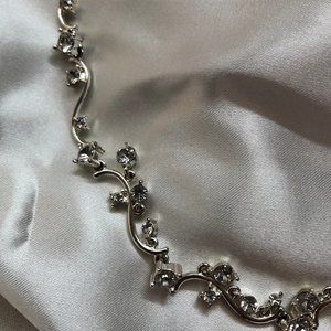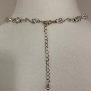 Silver tone metal with cubic zirconia necklace. 18 inches long plus an additional 3-inch extender. Makes getting dressed up for the evening exquisite. Excellent condition.