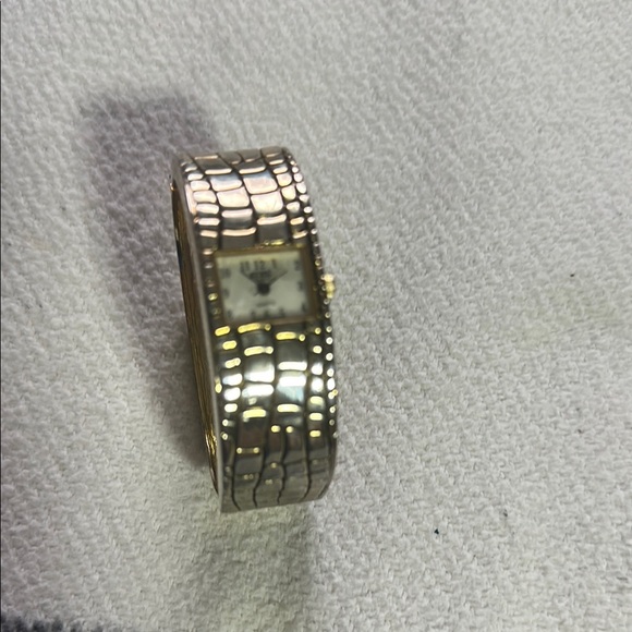 Sleek bangle watch with a croc-embossed metal band. Small rectangular dial with simple markers. 2.25” diameter Needs new battery