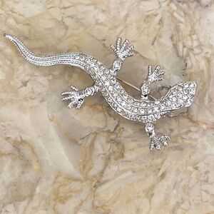 In as new condition lovely silver tone brooch, a crystal encrusted salamander, approximately 3” long.