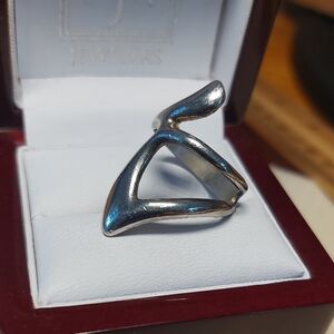 Neat ring in silvertone. Size 8. Abstract design.. normal minimal wear. Good preowned condition