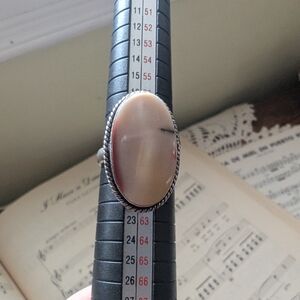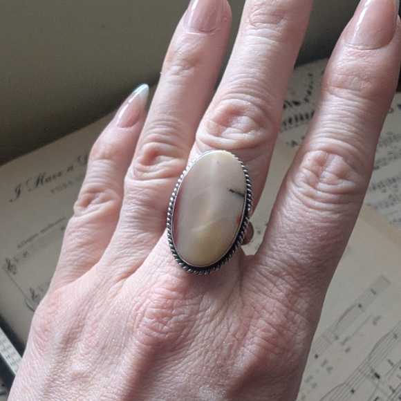 This elegant ring features a stunning cream oval stone set in a sleek silver band. Perfect for adding a touch of sophistication to any outfit.