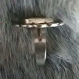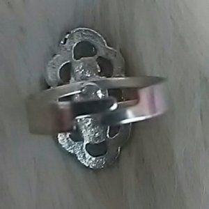 This silver-tone ring with white oval accent is great piece for a subtle yet elevated look. You can wear it on different fingers by simply adjusting the back. It's like having multiple sized rings in one. The material is unknown, may not be hypoallergenic.