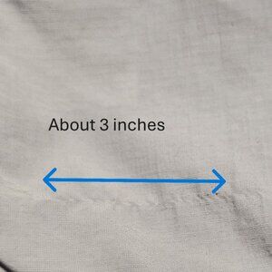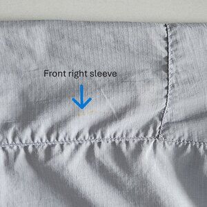 In fair pre-owned condition - Upon inspection, there does not seem to be any rips or holes. There are some small stains on the sleeves (pictures 12,13) and back (pictures 14,15) and about 3 inches of pulled thread (picture 16). Please reference the pictures for overall quality and condition of the item.