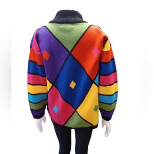 Vibrant and colorful this sweater has a geometric pattern and long sleeves. The top has a turtle neck and would fit oversized. Perfect for layering and very warm.