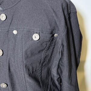 Stylish charcoal denim jacket by Simon Chang. Ideal for versatile wear.
